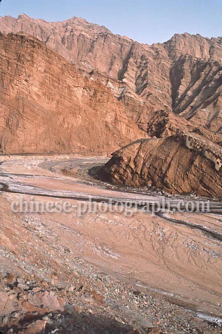 新疆ウイグル族自治区/キジルへの途中の道・山/シルクロード/キジール/自然風景