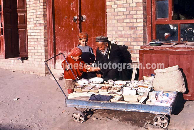 新疆ウイグル族自治区/カシュガル市/喀什/自由市場・老人と子供/料理/飲料水/食材/シルクロード